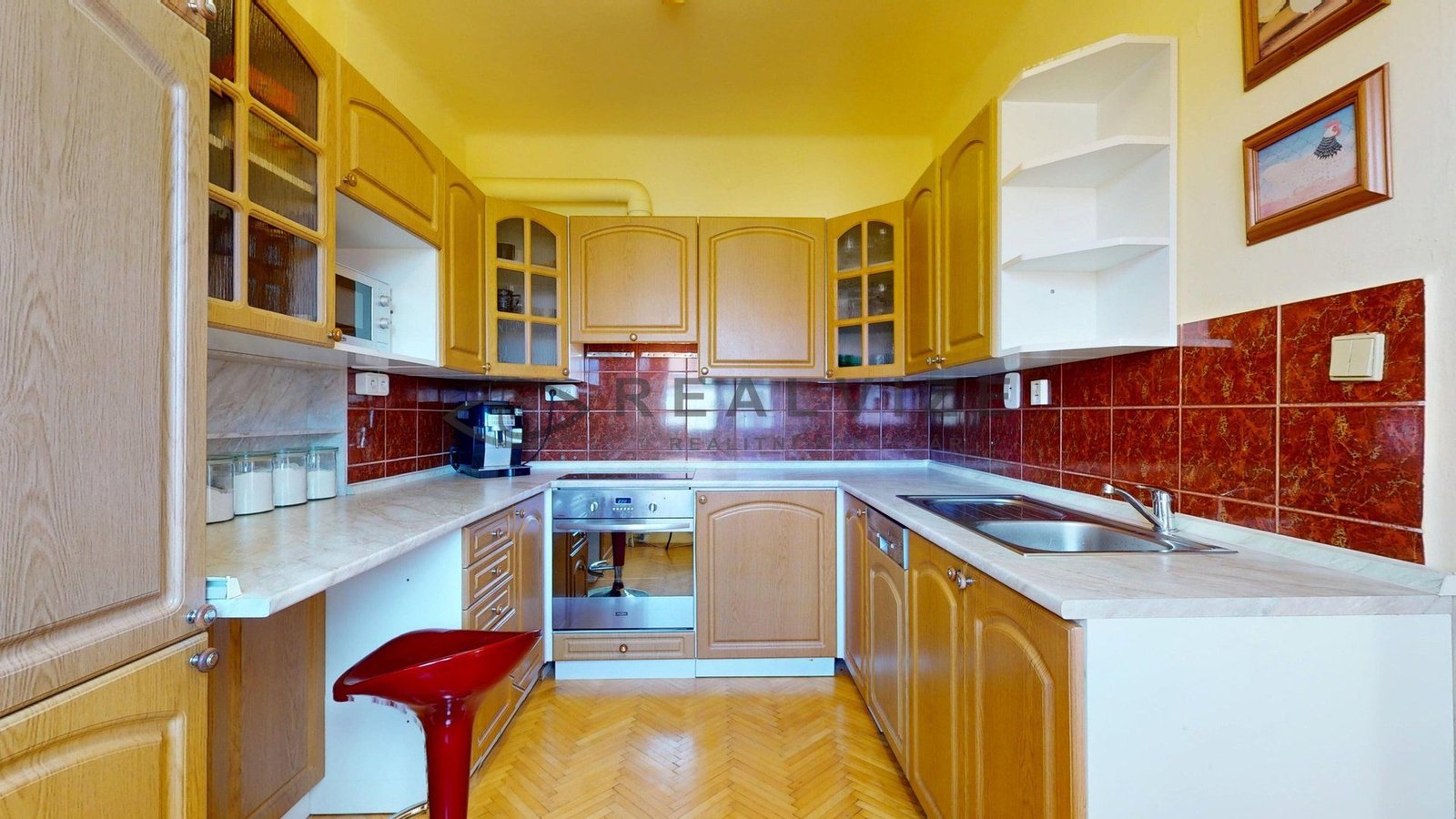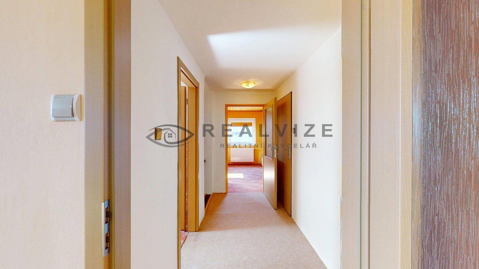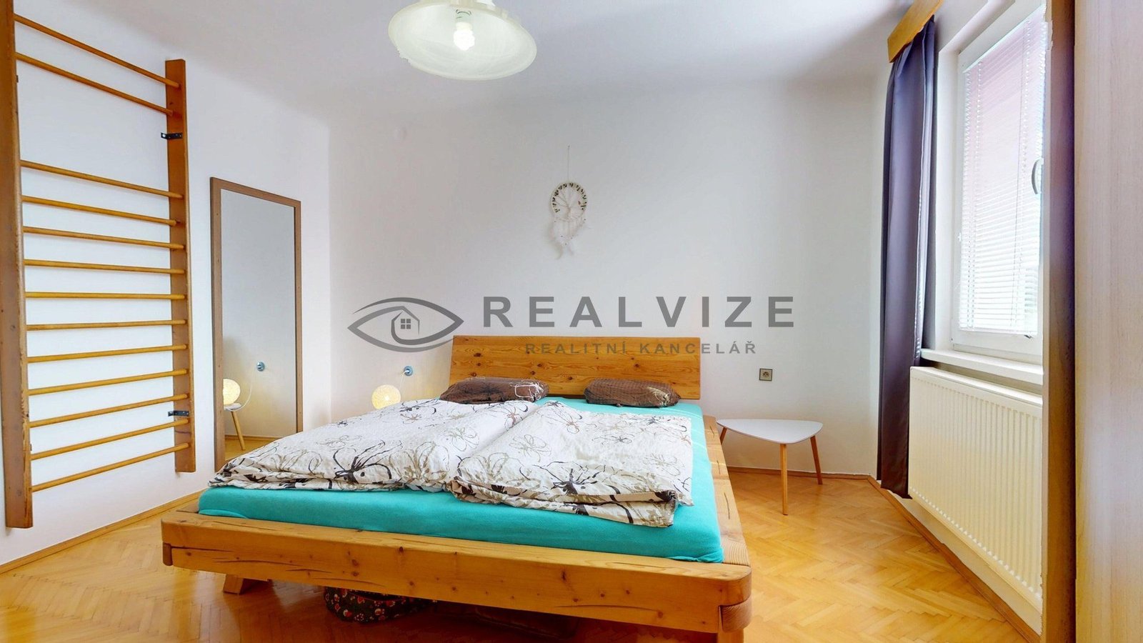 V 1. patře domu je potom mezonetový byt o dispozici 5+1 o 143 m2. Dominantou tohoto bytu je velký obývací pokoj s přístupem na dvě terasy, jak s výhledem do zahrady, tak s výhledem do ulice. Ve spodní části mezonetového bytu jsou dvě prostorné ložnice, malá komora a účelně vybavená kuchyně s veškerými běžnými spotřebiči. Ze společné chodby je přístup do koupelny s rohovou vanou a toaletou. V mezonetové části, přístupné po schodišti z obývacího pokoje, se nachází 2 velké pokoje, další koupelna se sprchovým koutem a toaletou a půda, ze které je možnost v případě potřeby vybudovat další pokoj.