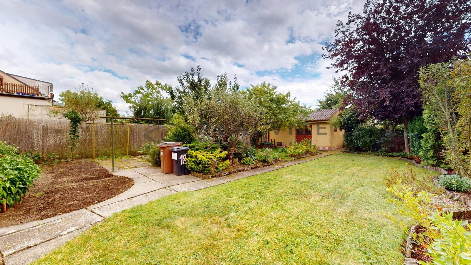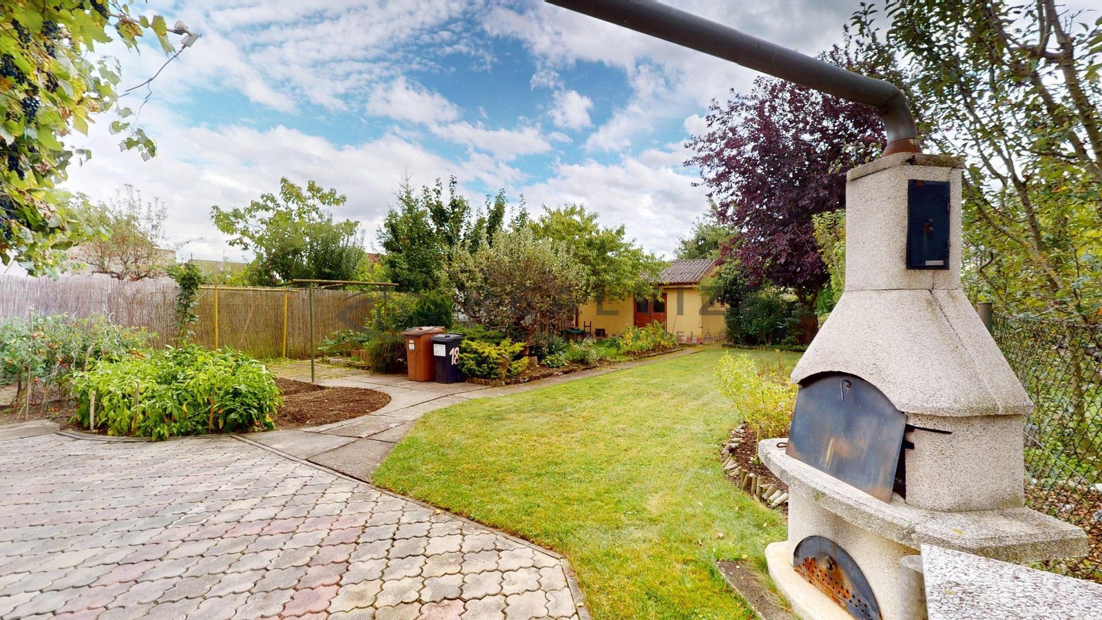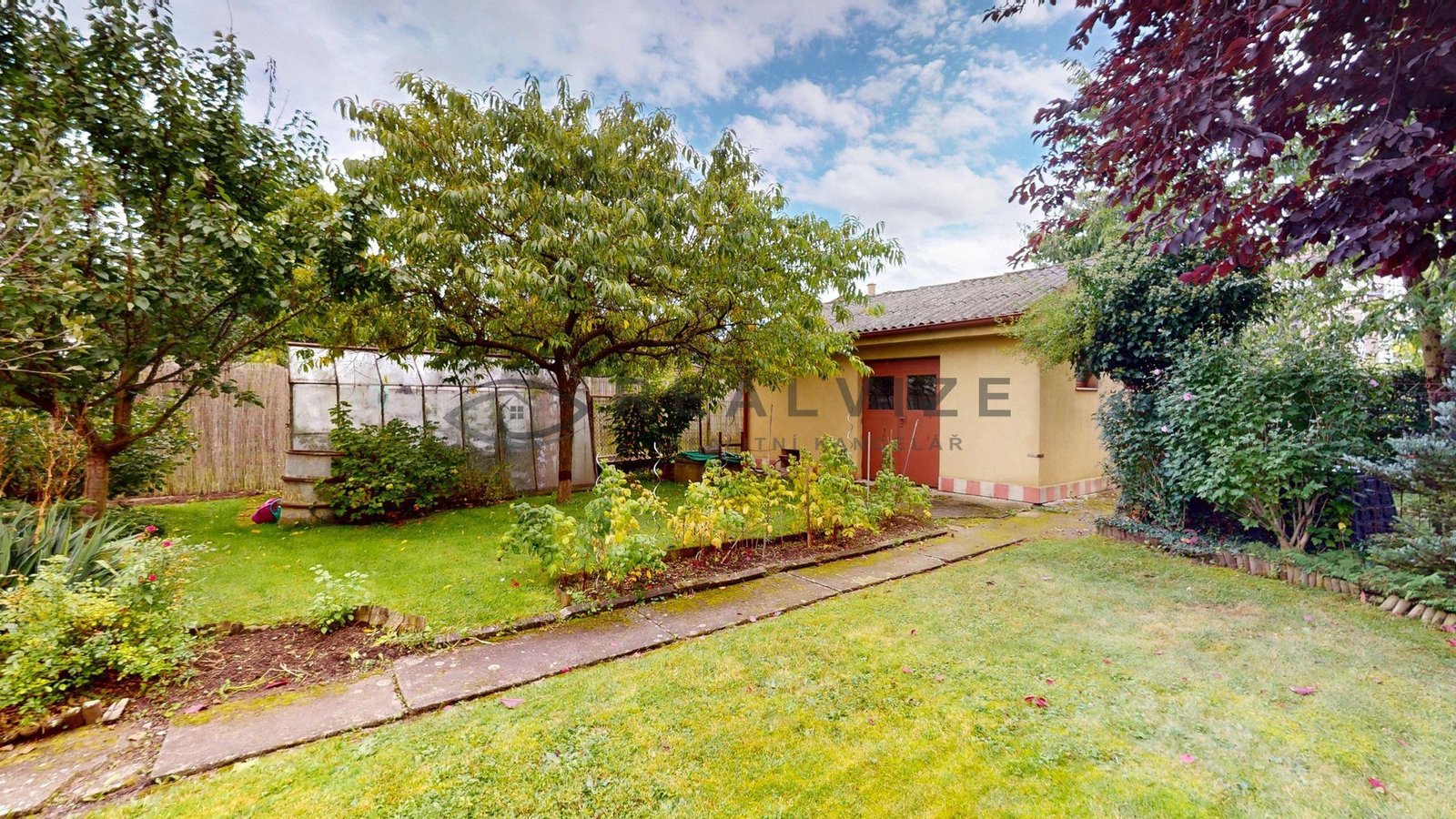 K domu náleží užitková zahrada 422 m2s ovocnými stromy, skleníkem a záhony. V zahradě je zděný a částečně podsklepený zahradní domek o 30 m2 k ukládání zahradního nářadí a pod.