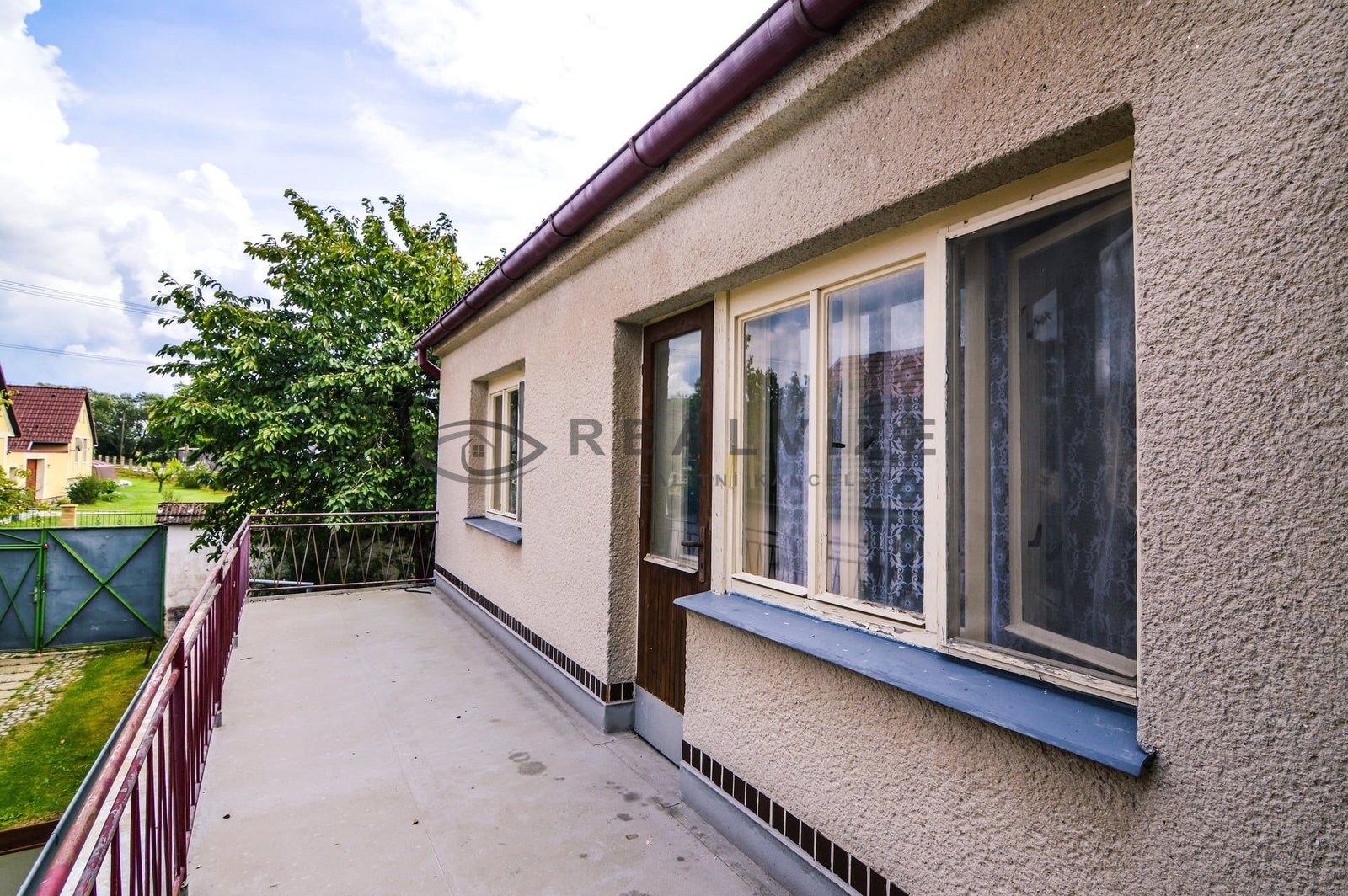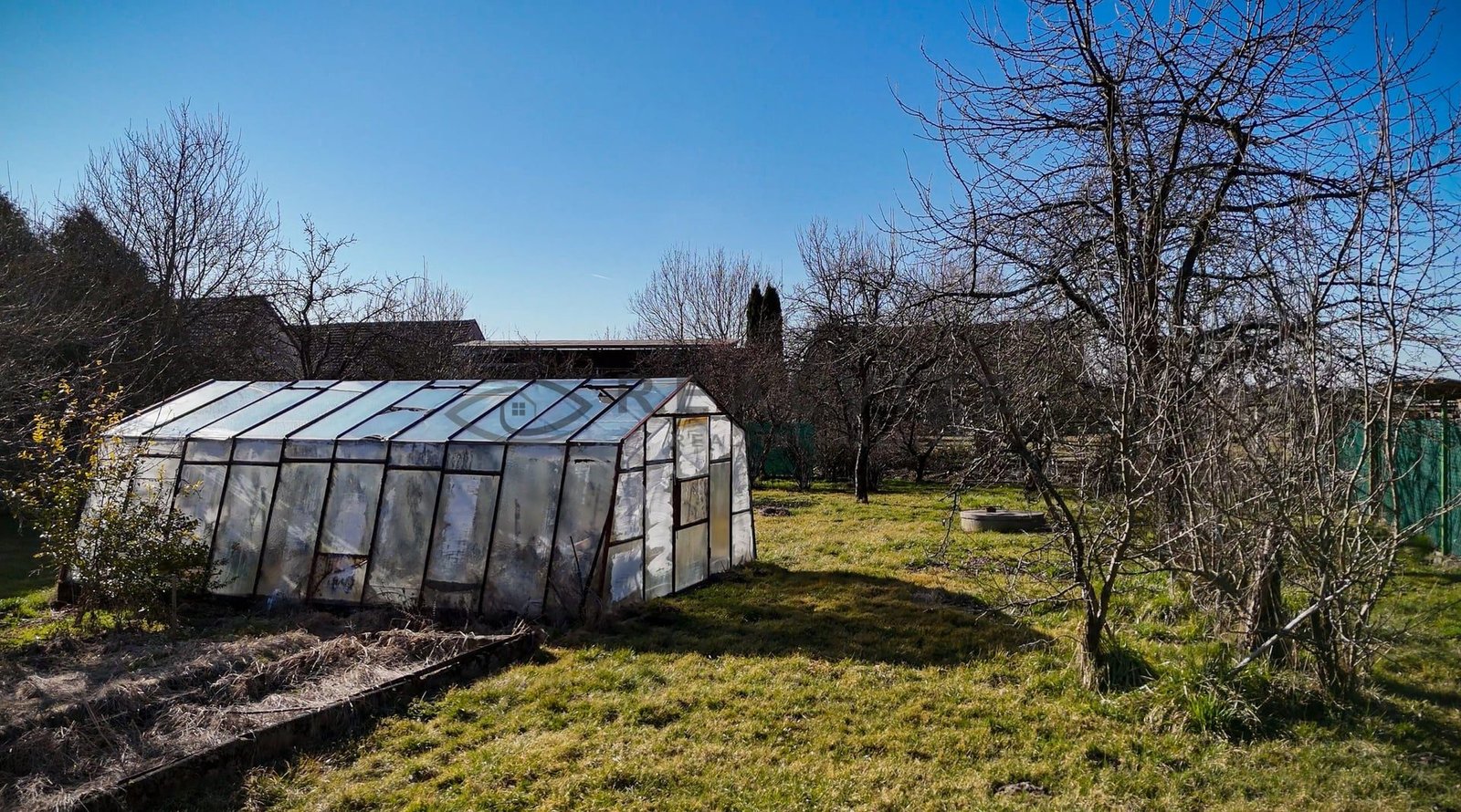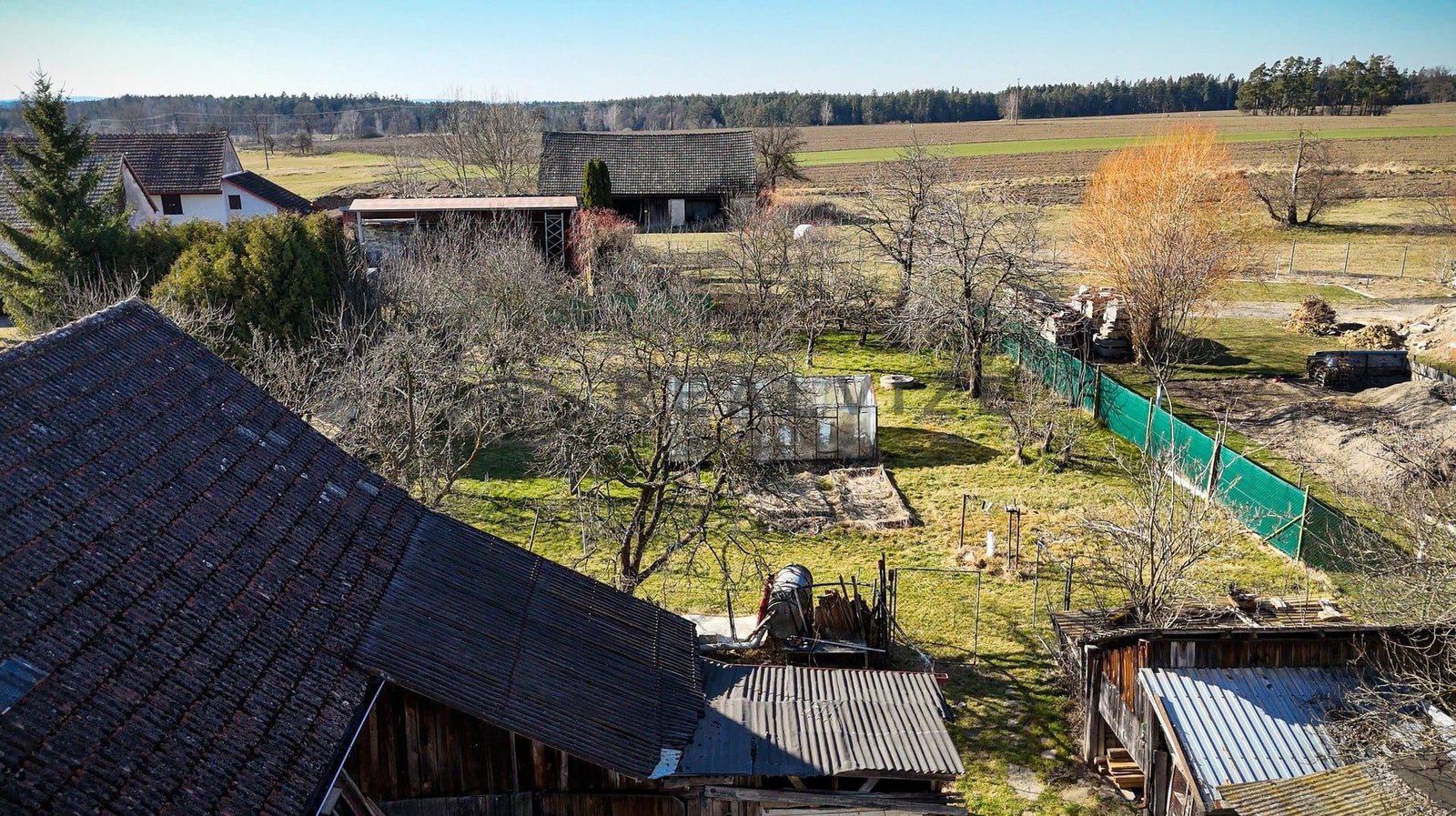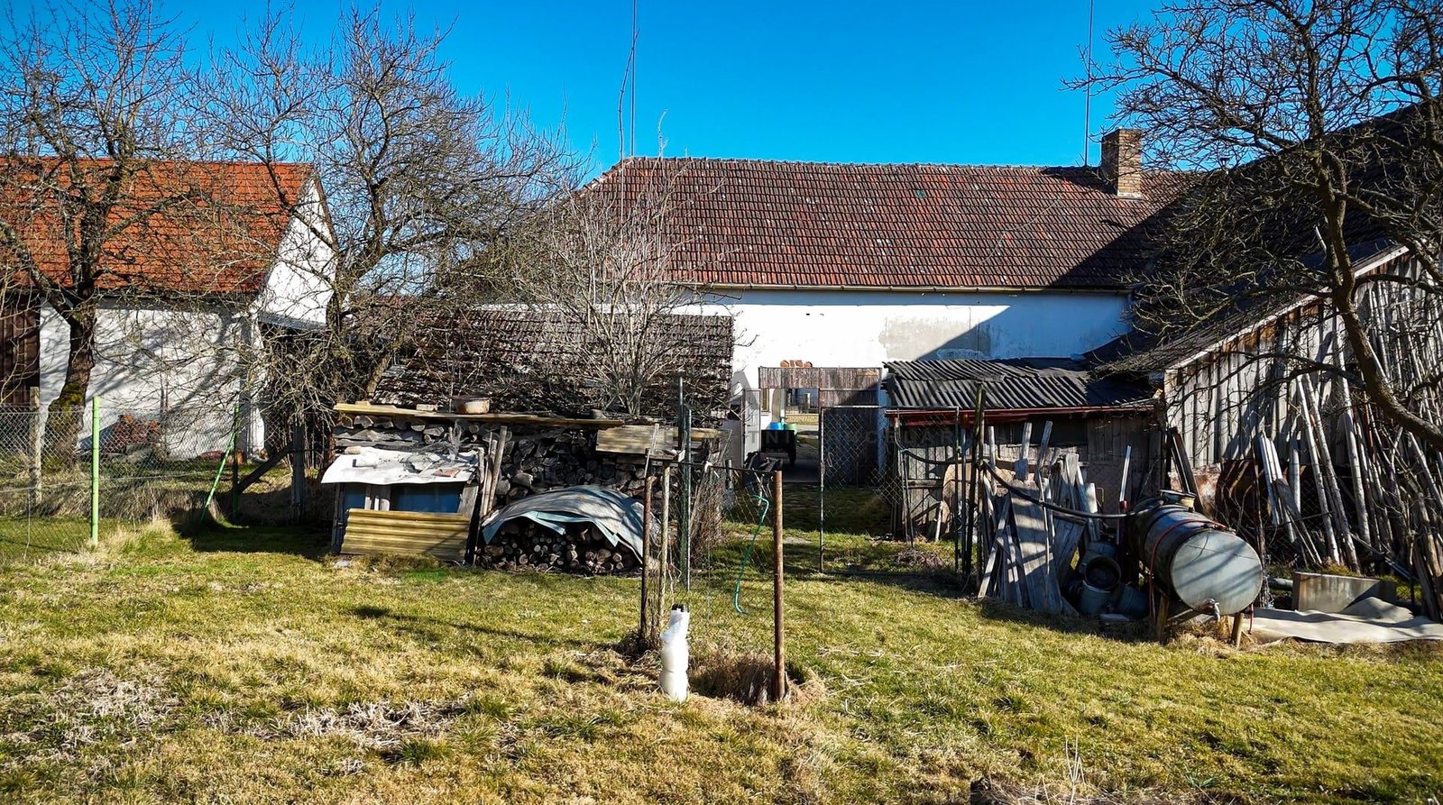 Za obytnými částmi je velká dřevěná kolna, zděný kurník a maštal, na jejíž úrovni již vstupujeme do rozlehlé, kompletně oplocené zahrady (889 m2) se skleníkem a vzrostlými ovocnými stromy a keři.