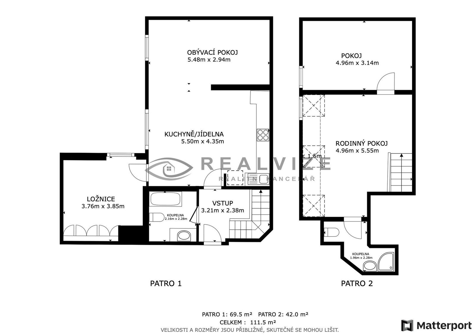V podkroví je další obývací pokoj, ložnice a koupelna se sprchovým koutem a toaletou.